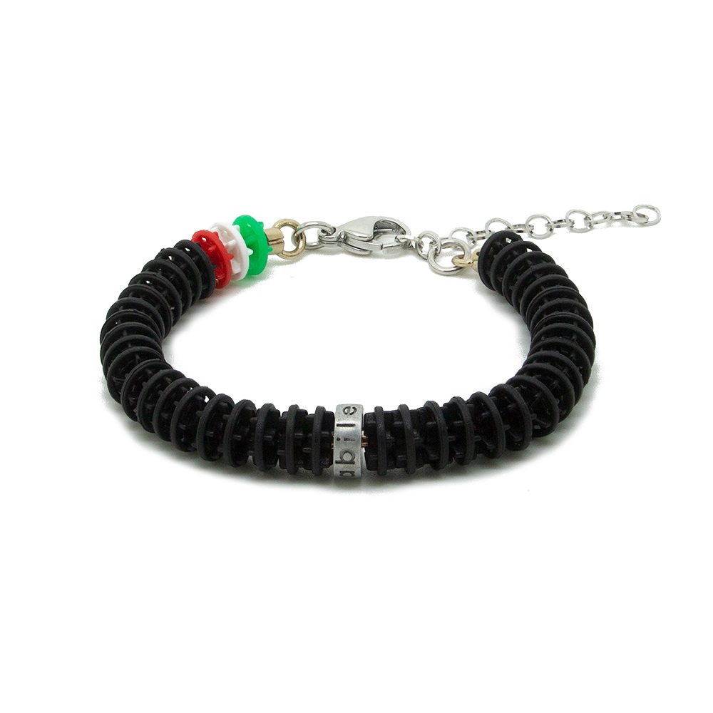 Bracciale realizzato in bronzo ed elementi in plastica riciclata dalle corsie dismesse delle piscine. Il design raffinato, perfetto per chi pratica sport e segue le proprie passioni.